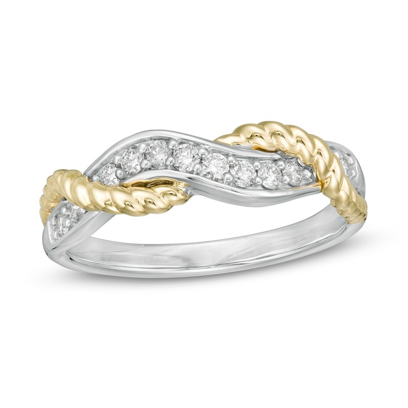 Crafted from sterling silver and warm 10K gold, this ring is sculpted with silver-tone diamonds and finished with a gold-tone rope ribbon. Weighing 1/4 carat and polished to a brilliant shine, this ring will complement any outfit. This ring is only available in size 7. Sterling silver rings cannot be resized after purchase.